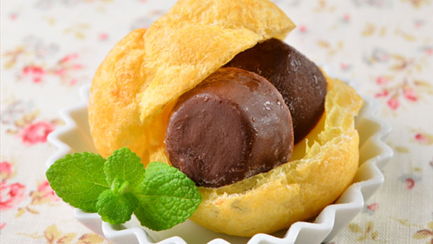 シュークリームに切り込みを入れ、ピノをはさみます。